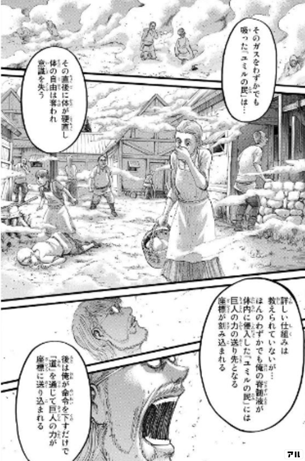 そのガスをわずかでも吸った ユミルの民 は その直後に体が硬直し 体の自由は奪われ 意識を失う 詳しい仕組みは教えられていないが ほんのわずかでも 俺の脊髄液が体内に侵入した エミルの民 には 巨人の力の送り先となる 座標が刻み込まれる 後は俺が